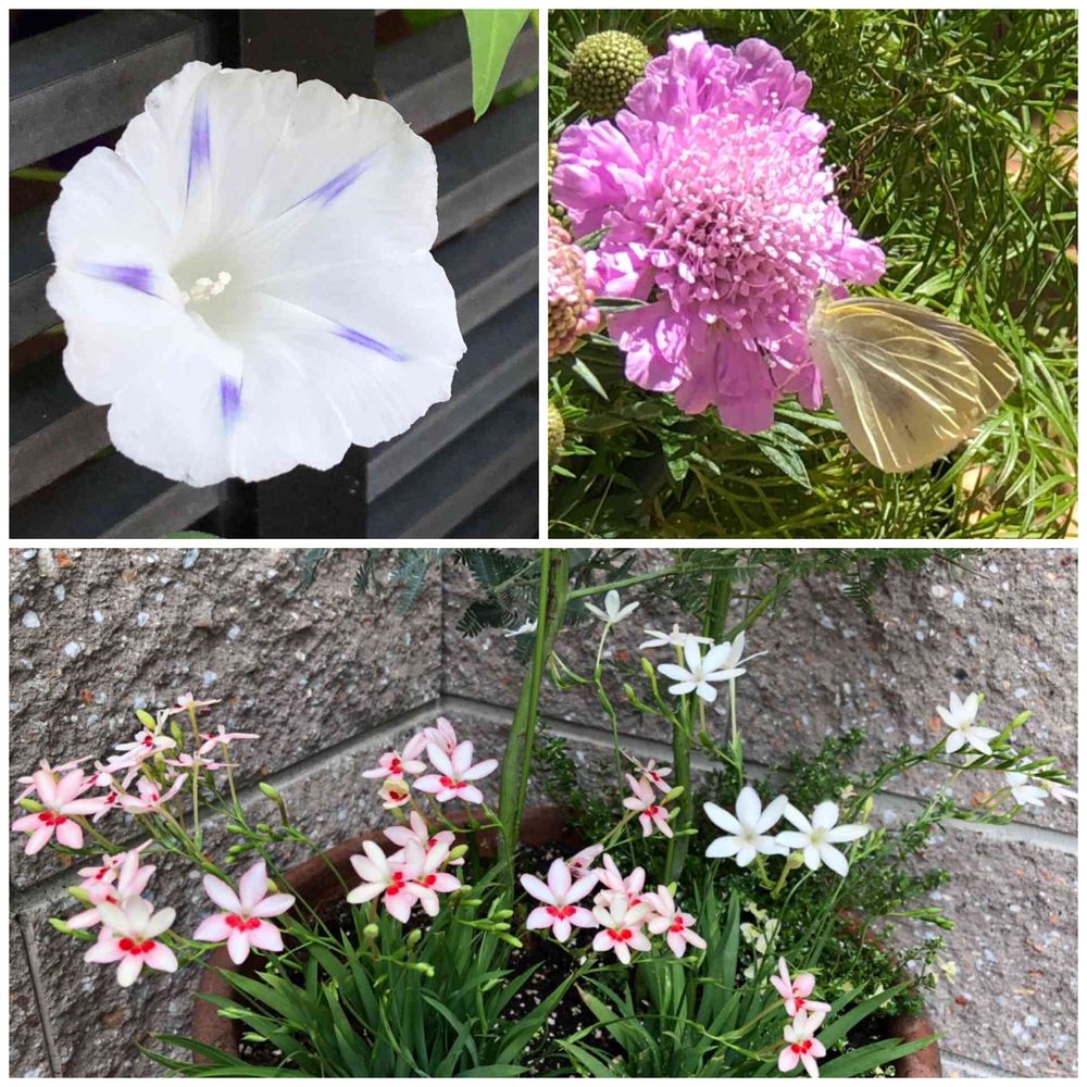 白い朝顔、紫の差し色があって綺麗ですね、、ピンクのスカビオサさん、可愛い!お客さんも来て嬉しいね😆