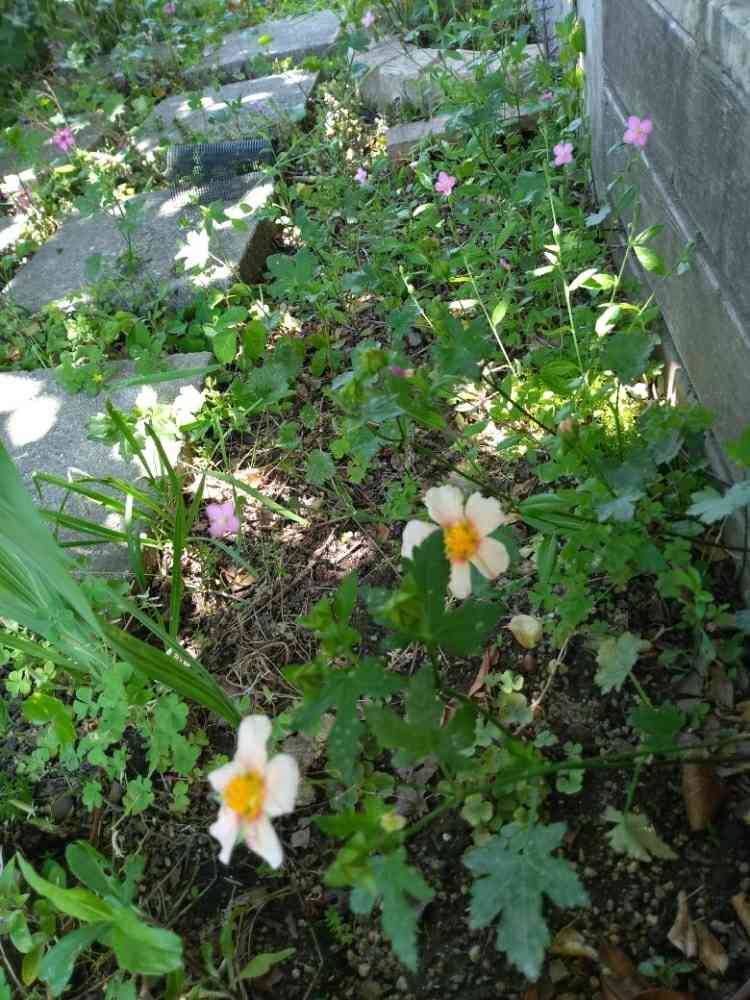 今はマルバストラムと、オシロイバナと、オルラヤと、オギザリス?が勝手にさいてます。、背の高いグラジオラスまで、グングン生育。