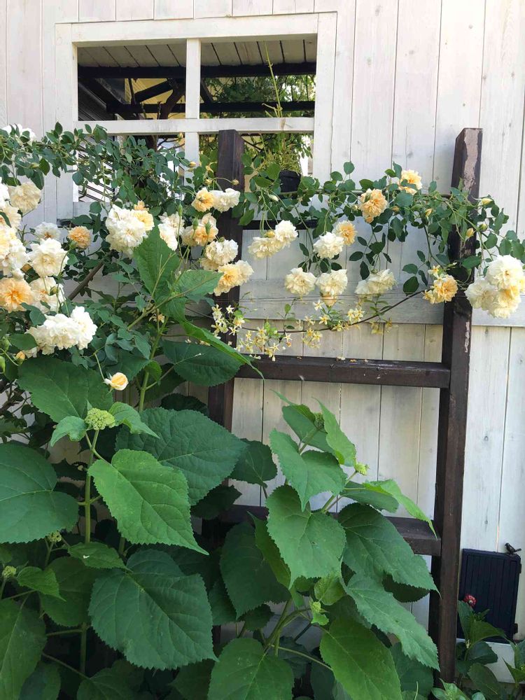 バラ アリステラステラグレイと蕾が膨らんだアジサイ アナベル🌱