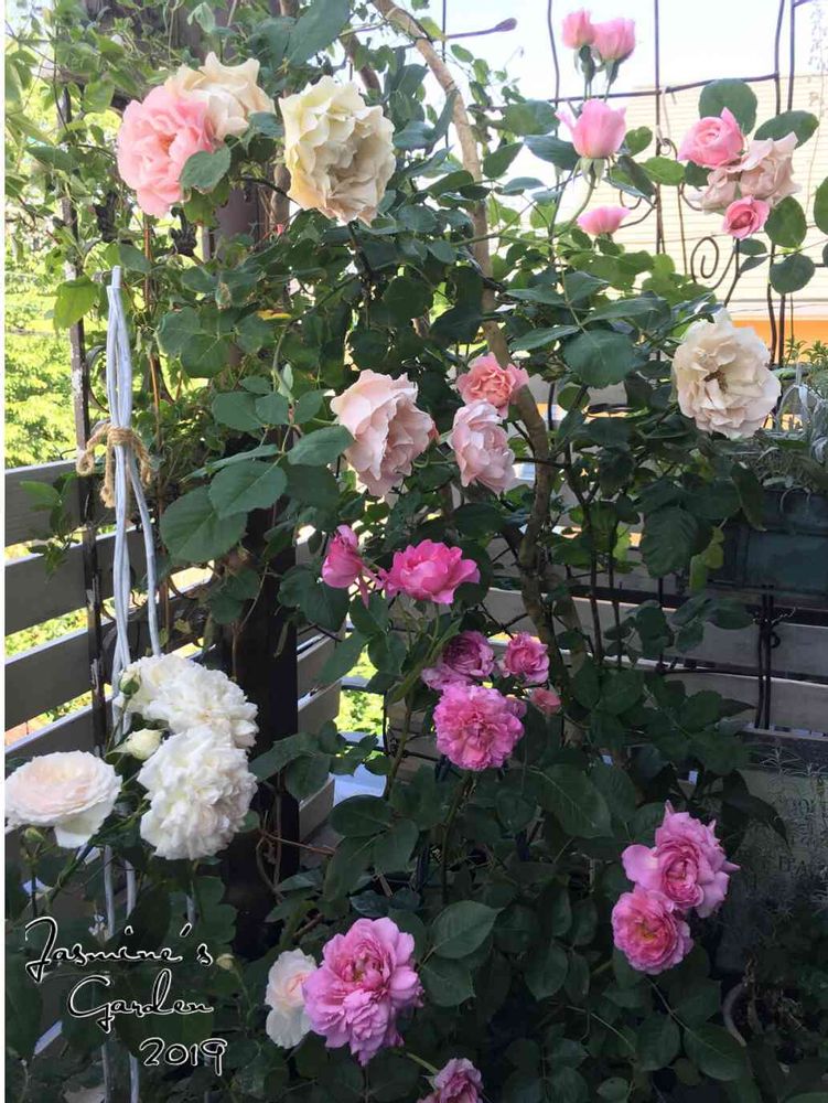 モルタルの枝のアーチにダフネを誘引していますが、更にアーチの上部、バルコニーのひさしの方に誘引する薔薇を物色中🤔