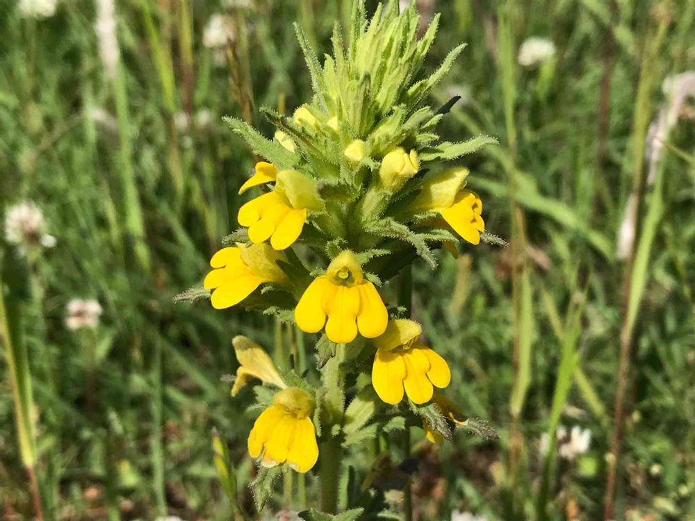雑草の海の中で、鮮やかな黄色が目を引きます。