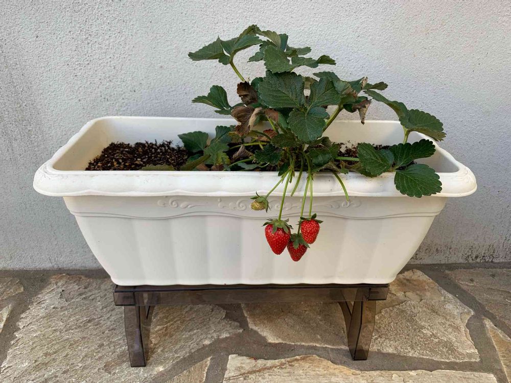 イチゴの土でプランター植え、4粒ほど収穫したカレンベリー 。シュートはいつ出るのかなあ?