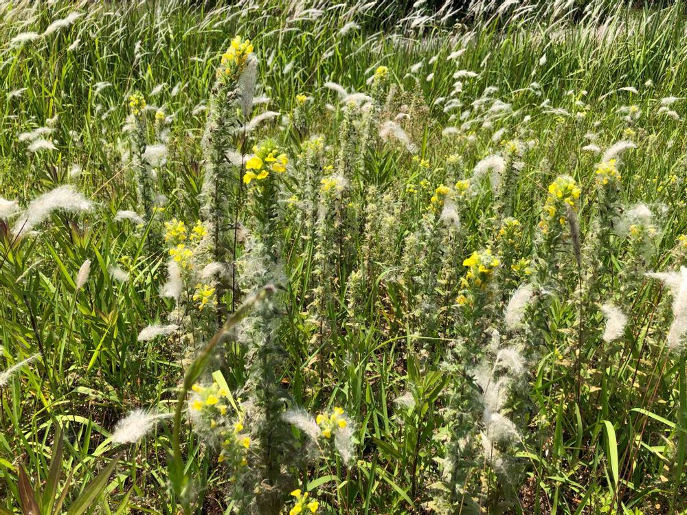 チガヤの綿毛が絡みついてモフモフになっているセイヨウヒキヨモギ