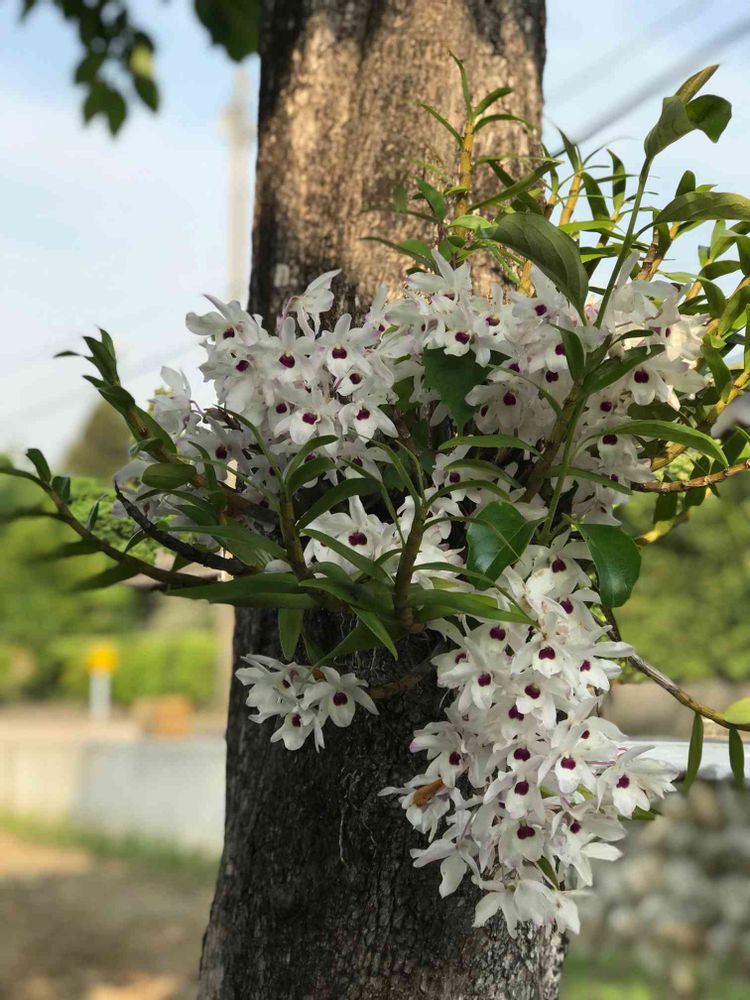柿の木の枝を落としたところが少し窪んでいて、そこへ蘭を根ごと接ぎ木?したようです。不思議ですよね。蘭も何十年も咲き続けています。水やりもしません。柿の木と共存しているようです😍