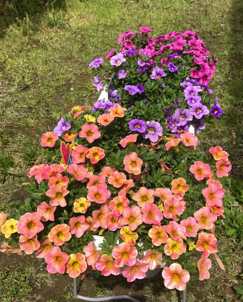 春先に安売りというかたたき売り状態だったカリブラコアを6鉢買い、プランター2つに寄せ植えしました。