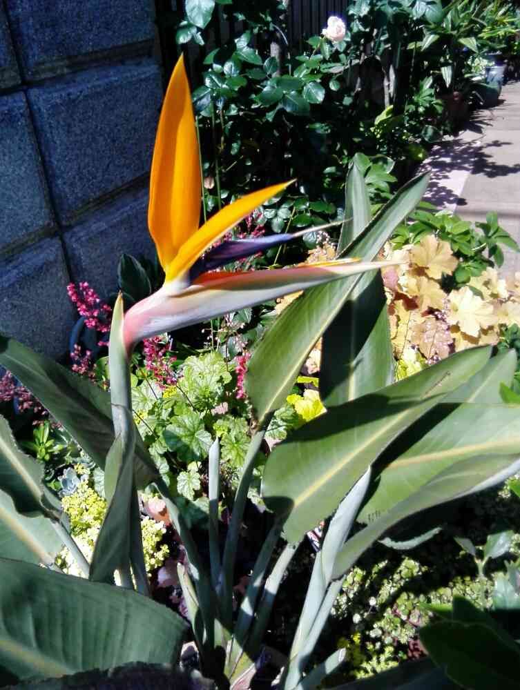 ストレチア レギネの蕾がでてから約一ヶ月、この暑さで今朝やっと花が開きました。朝日をいっぱい浴びてエキゾチックです!