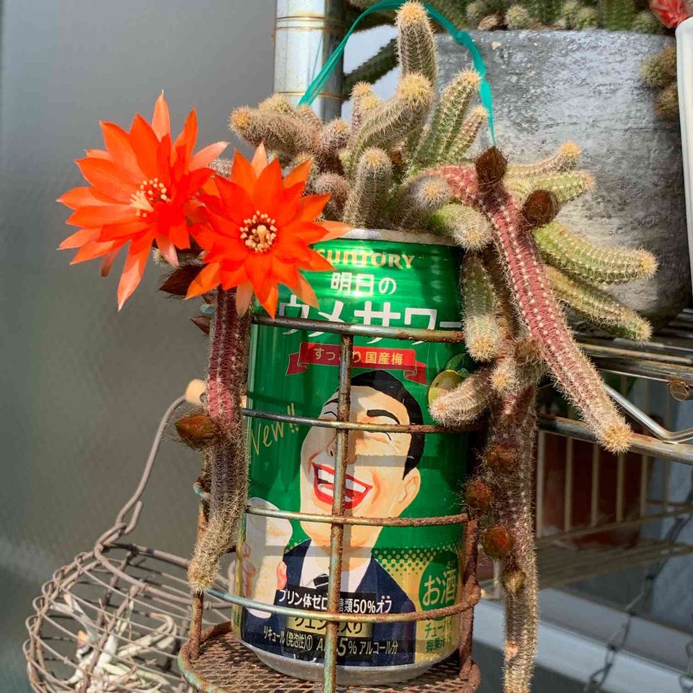 缶のモデルが白檀の花眺めて呑んでるような位置で咲いてる😆😆😆プハーッ(*゚▽゚)ノ🍺