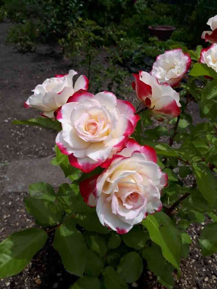 強香のバラが好きなので匂い的には物足りませんが、花は沢山で大きく、白に濃いピンクの縁取りが庭を華やかに彩ってくれます。