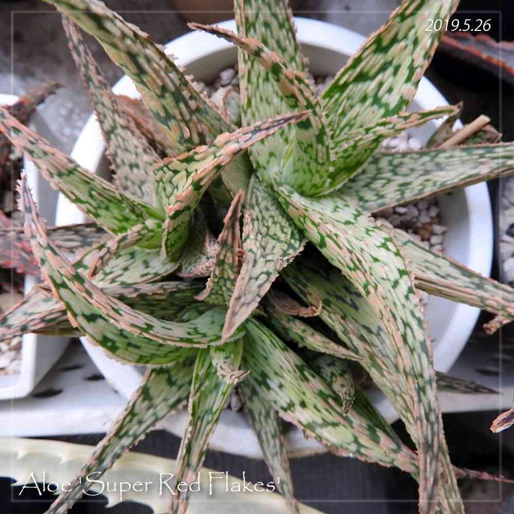 アロエ、スーパーレッドフレーク……と言う名前で買ったアロエ。スーパーレッド度言うほど赤くならない。ピンクブラッシュにとても似てる。育て始めて4年目、支所は一株だったのに、今では群生株。
