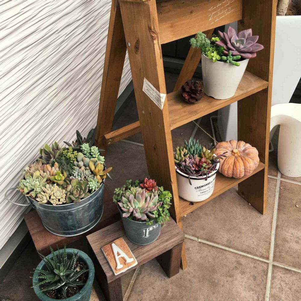 玄関の多肉コーナー💕お庭のと入れ替え。☺️ウッドデッキの切り落とし分を取っておいたので ボンドで即席の台を作りました。左ね。🙌🏻😛