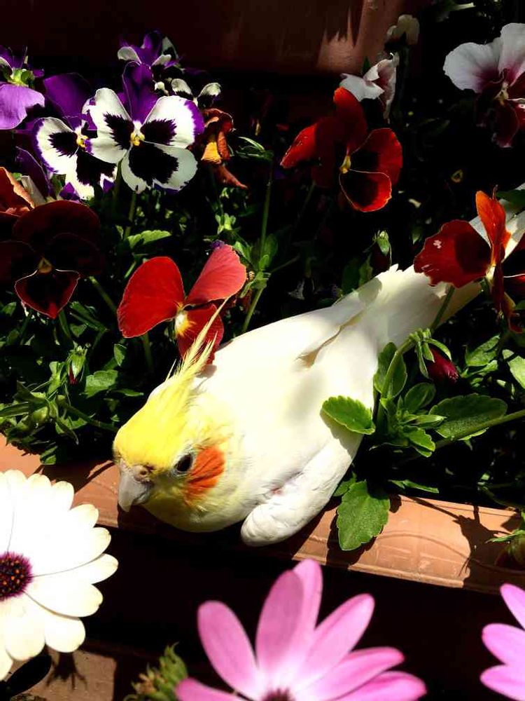 パンジーの中にいる、オカメインコのピッコロちゃん💜