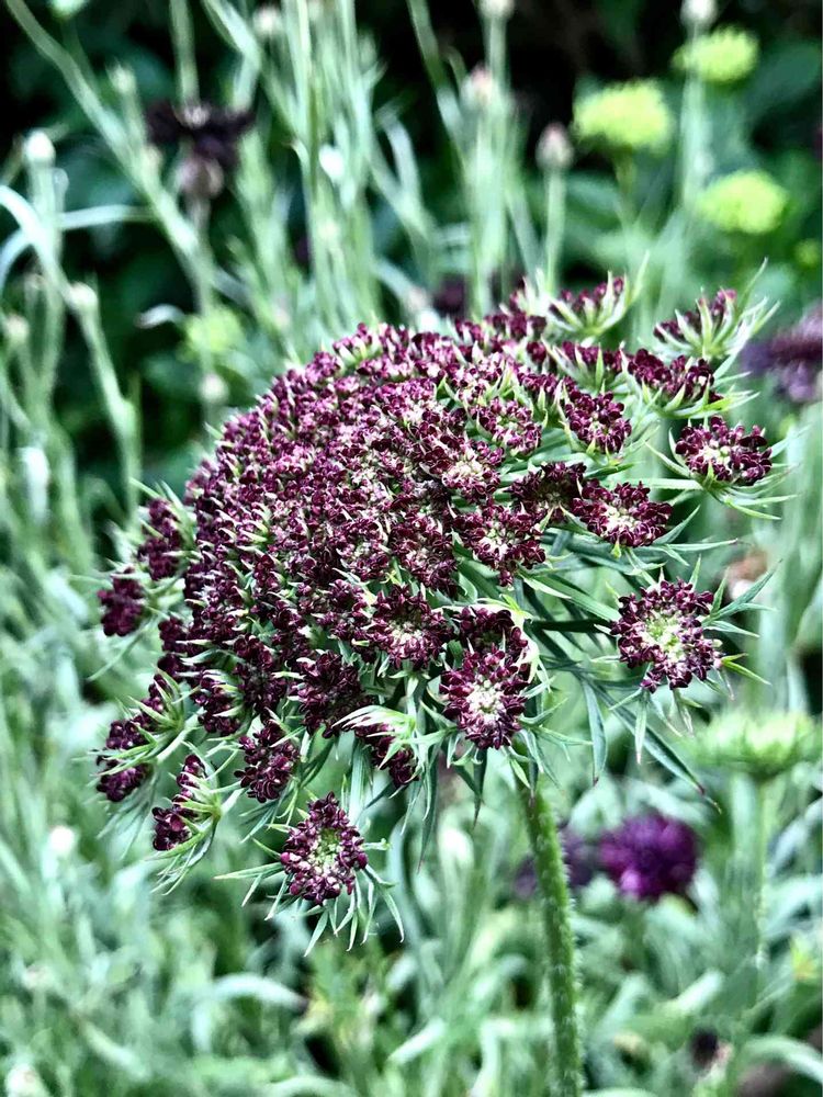 🏷みたら、ノラニンジン、ブラックレースフラワーとあり根は黒いニンジンの様になるとありました。葉はニンジンみたいですよ。