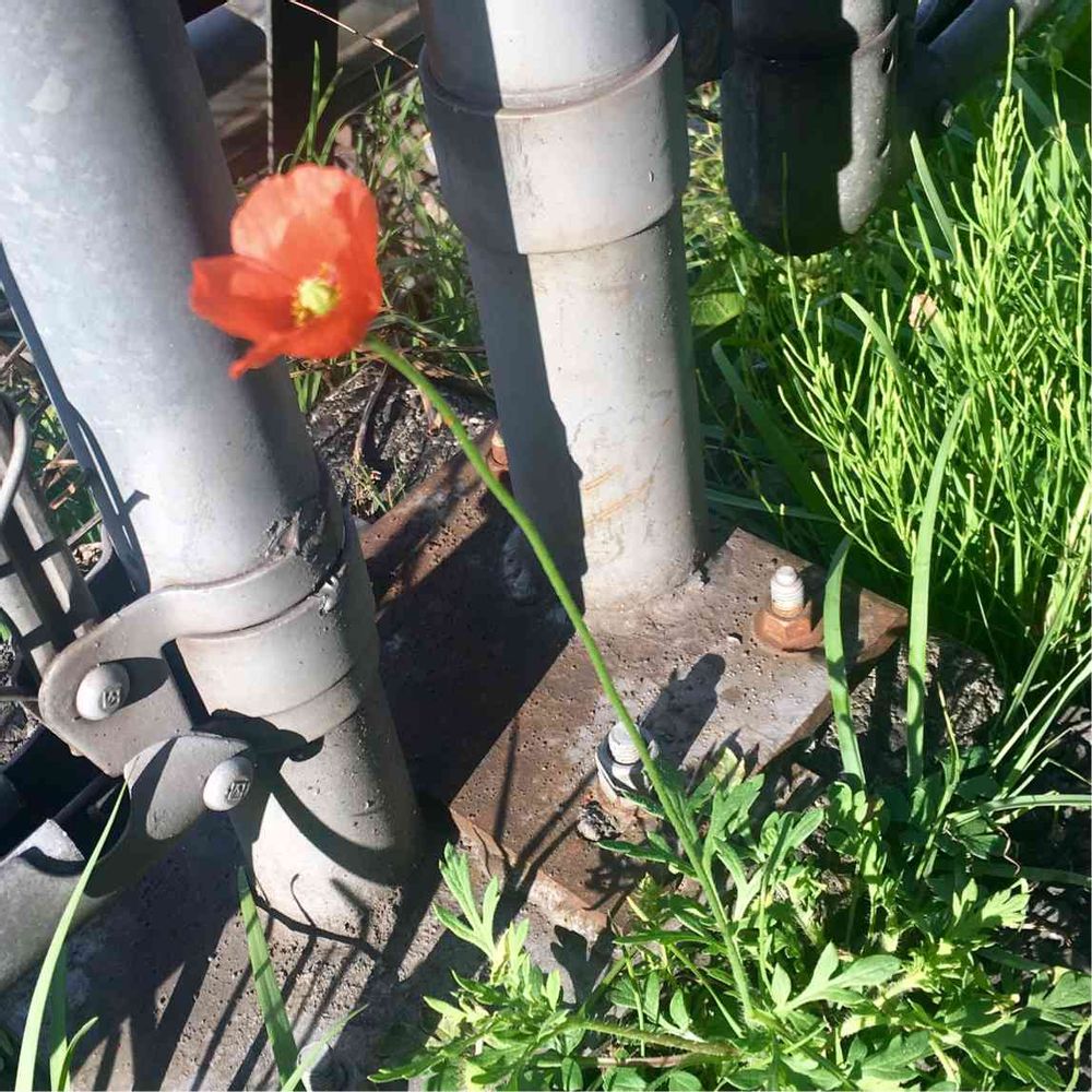 猛暑でぐったり通勤していると、電車沿いに一輪のポピーが。