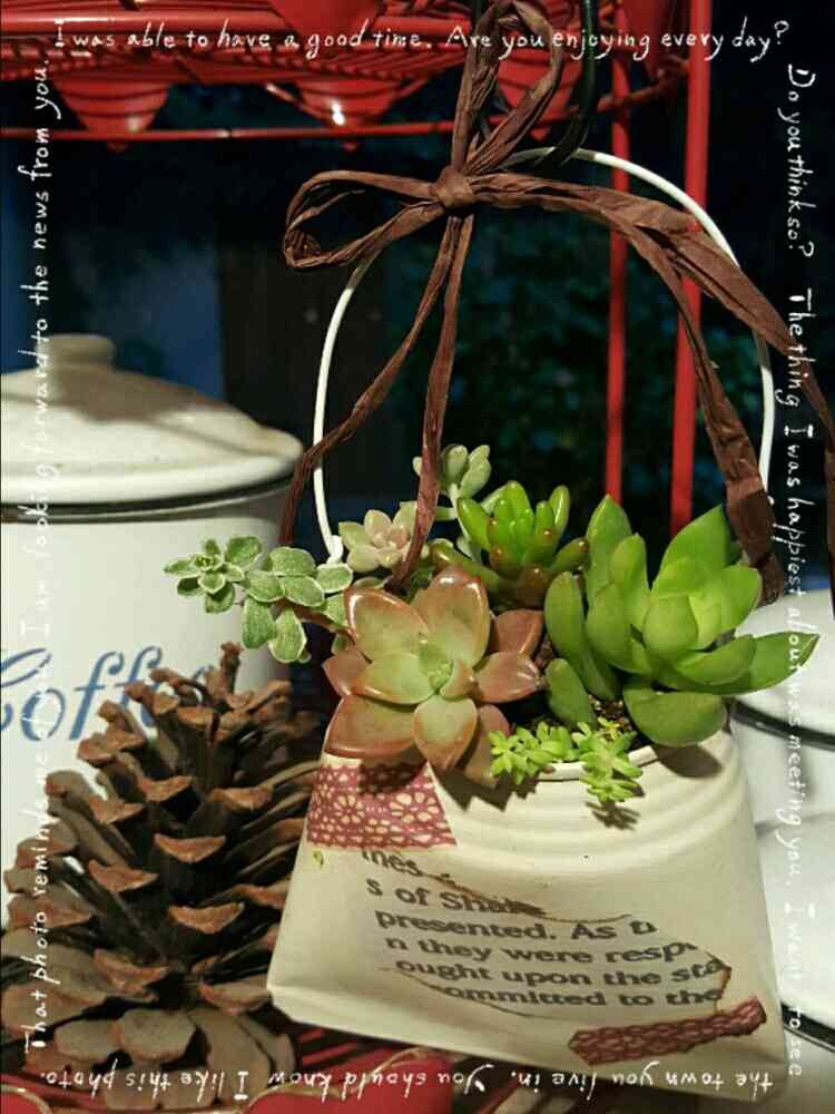 昨日作ったリメ缶バックに寄せ植え作りました〜