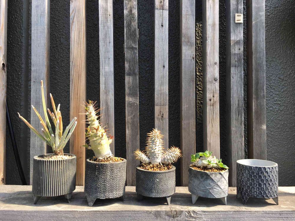実生パキポディウム三鉢をお気に入りの鉢に植え替え。