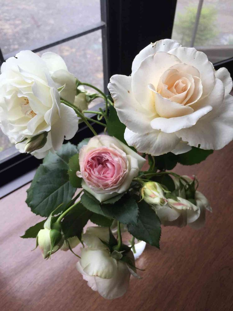 昨日までの暑さで茎が折れたものや、花がら摘みをしながら、剪定したものを集めて生けてみました〜