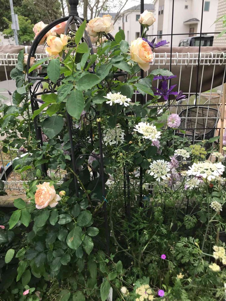 ペッシュボンボン、オルレア、クレマチス アフロディーテ エレガフミナ、レイニーブルーが、やっと先揃いました(*ˊ˘ˋ*)。♡:*°