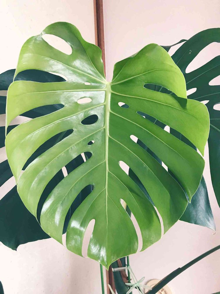 15cm位の切れ込みの少ないモンステラが1年前で35cm級の葉っぱに成長する様に…