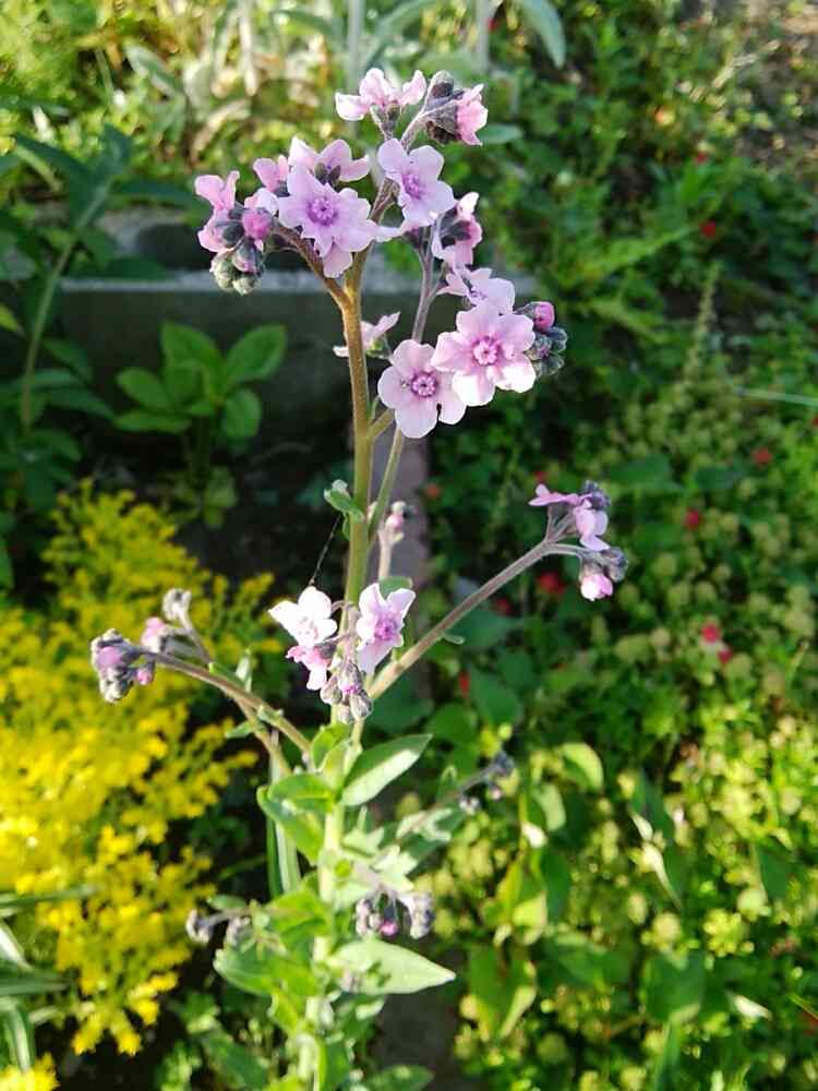 シノグロッサム(支那ワスレナグサ)がこぼれ種から咲きました。ブルーもあったのですが、ピンクだけ何本か咲いてます。