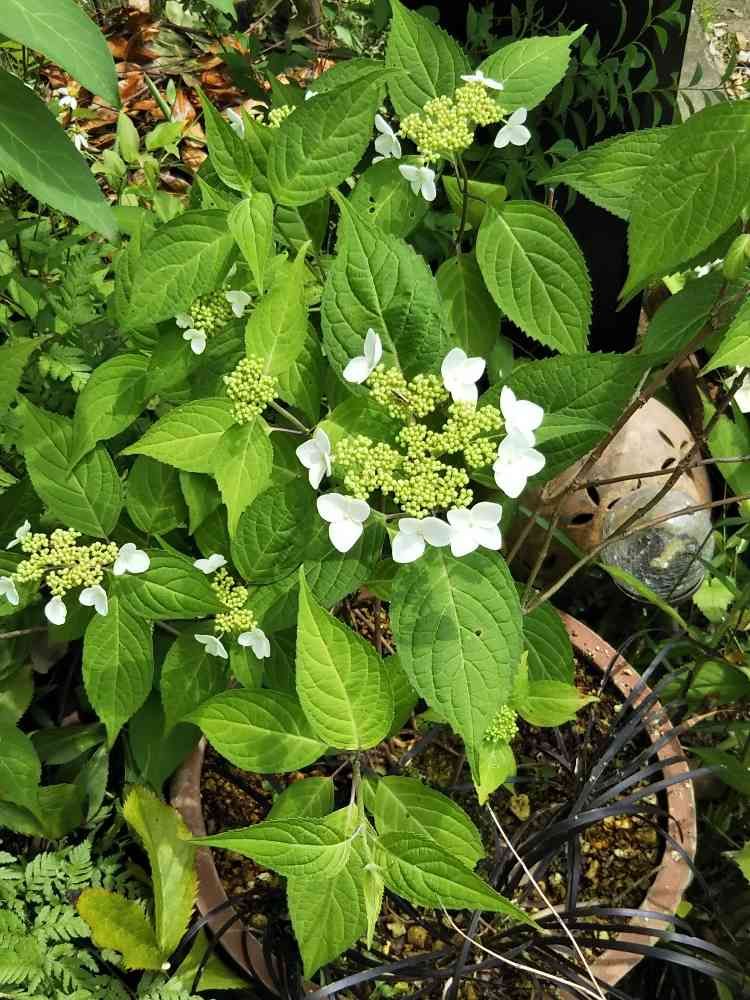 ヤマアジサイ`紅´花がずいぶん開きました😊もう少しすると紅に染まってきます✨