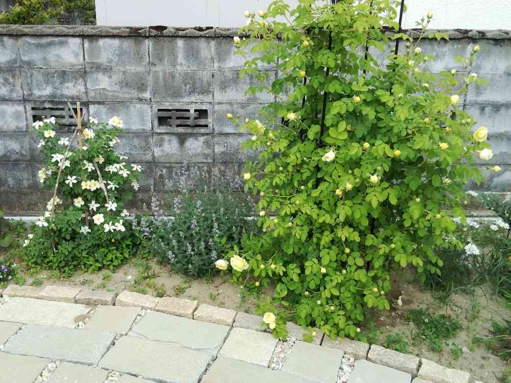 明らかに、葉色は薄く花の色も中心部が濃い黄色になるところ、薄いクリーム色です。成長著しく、花芽のついた枝は長く蕾も豊富です。