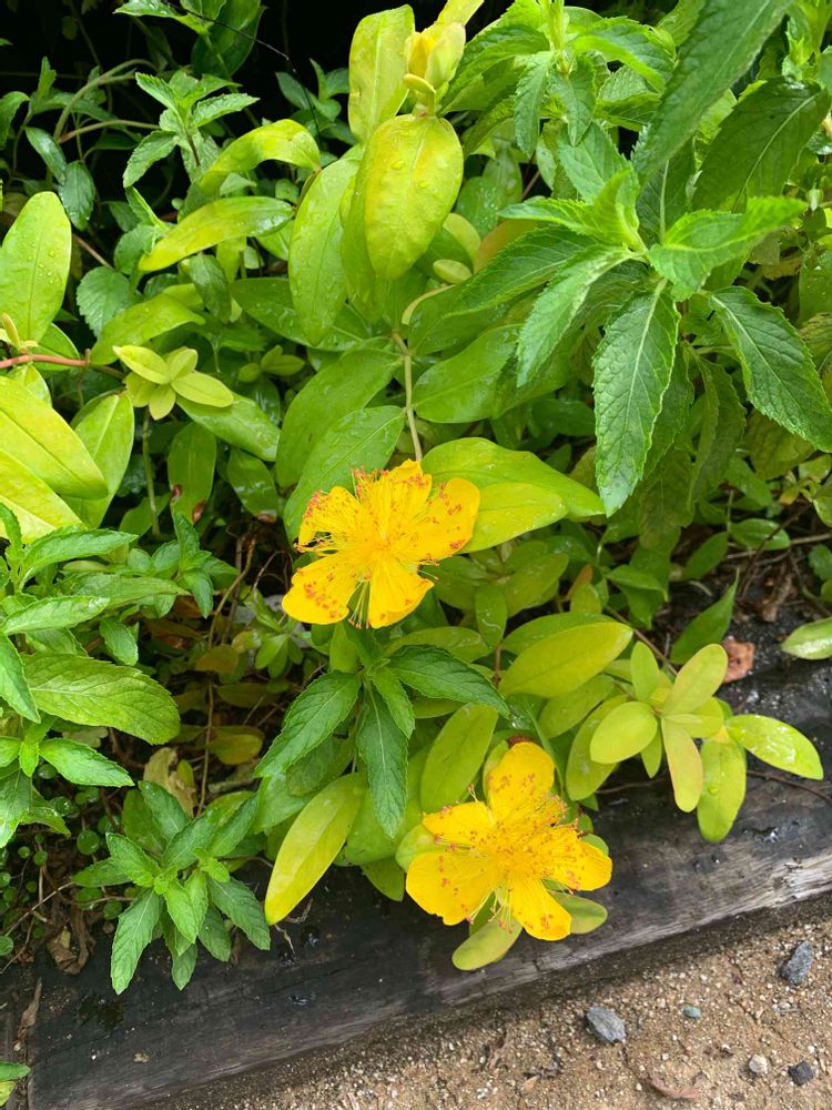 ミントの茂みの隙間からヒペリカムゴールドフォームの花!葉っぱの黄色が可愛くて植えたので、花も咲くのね、とちょっとびっくり 笑