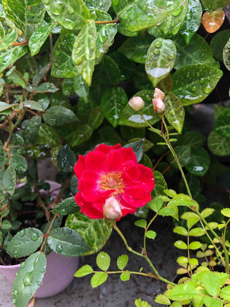 ベランダを見たら、去年実家から一枝貰って挿したミニつるバラが一輪咲いていた