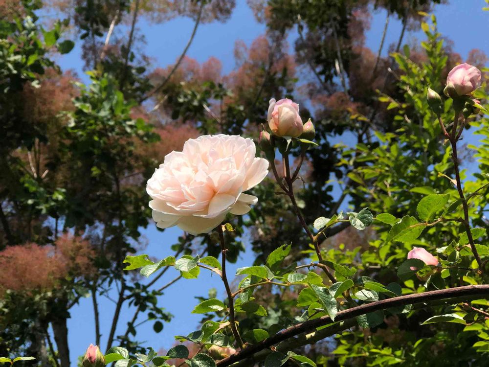 スモークツリーの前で咲き出した“ジェネラスガーデナー” とっても優しい色です🎶