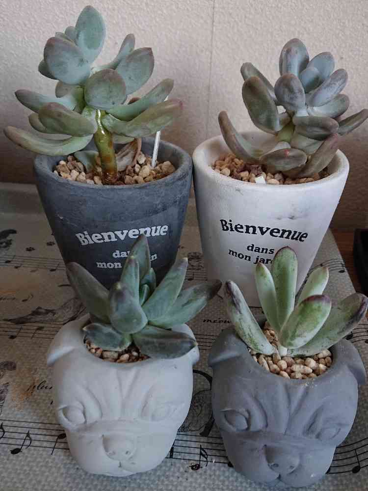 おはようございます✨セリア行ったら🐕顔のかわいい鉢が🎵グラウクムさんと福娘さん植えちゃいました😃