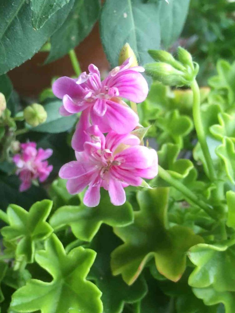 4月投稿のアイビーゼラニウムに続き、ようやく開花のアイビーゼラニウムその2のお花🌸です❣️ こちらはライムグリーンの葉にピンクのお花でした😊