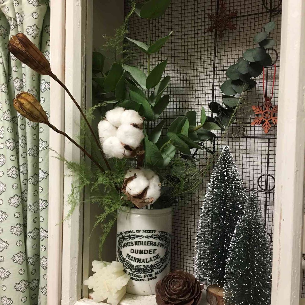 実家からもらってきた百合の実と、探し回っていたら、フツーのスーパーの花売り場にあったコットン。ダイソーのツリーで、クリスマス❤️🌲