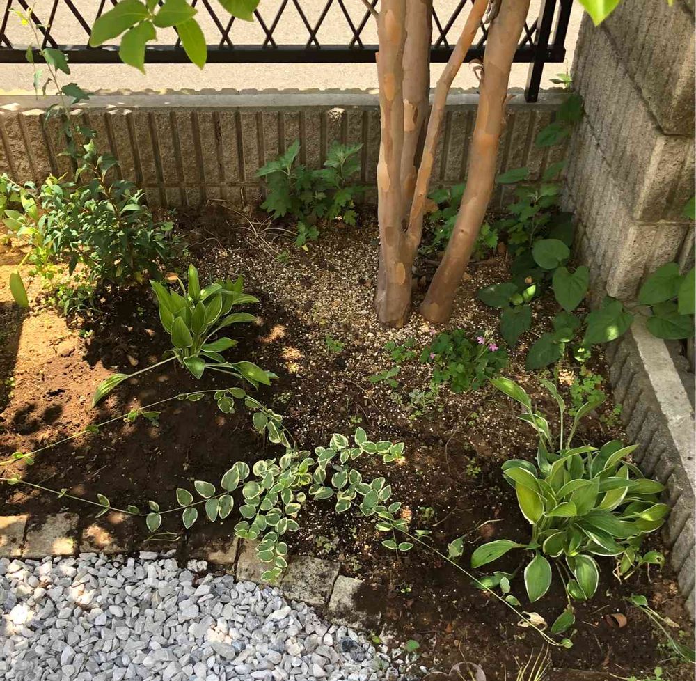 ギボウシとドクダミが混ざって大変だったエントランス横を整理しまして、ナツツバキの根元にギボウシさんだけお引越し 頑張った😊