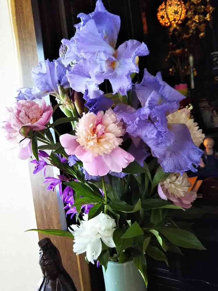 豪華でしょ、自宅で花咲いた物で仏壇用の花造りました。ジャーマンアイリス、シラン、芍薬三種とデカイ(ニンニク見たいな種でした)ネギ坊主です。