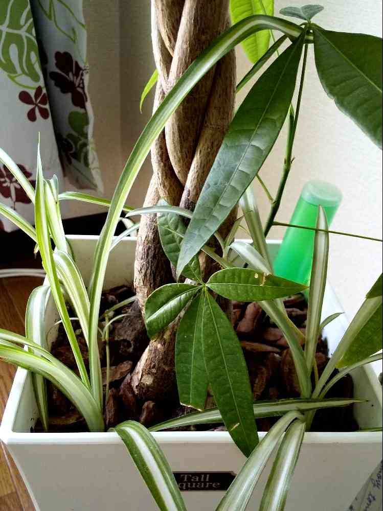パキラの鉢にオリヅルランのこどもを植え込みました。スクスク育っています。