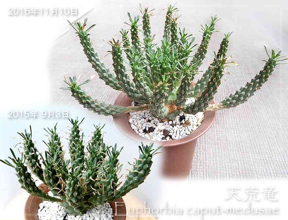 もういっちょ比較、天荒竜。これは植え替えてないので鉢の大きさで縮尺を合わせてあります。枝も長くなったし、枝ぶりもぐんと大きく、中心部に新しい枝が大増量。この調子で来年もお願い。……目先の目標は無事に冬越し!