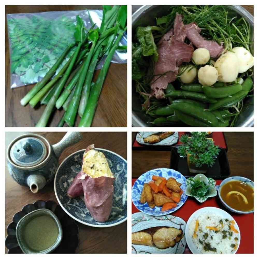 さあ右下が本日のメインイベント🎪ワンコイン定食です。茗荷竹と人参のみ合わせて下処理なしで、味を整え炊き込み御飯。冷凍から出した筍と油揚げのカレースープ。またまた葉を茂らせた山葵の醤油漬け。人参とハンペンの煮物。さてさてシェフの妹が特売情報で買ってきてくれた立派な鰤の照り焼きに、木の芽を付け忘れたので、あなた方の想像力に期待します。