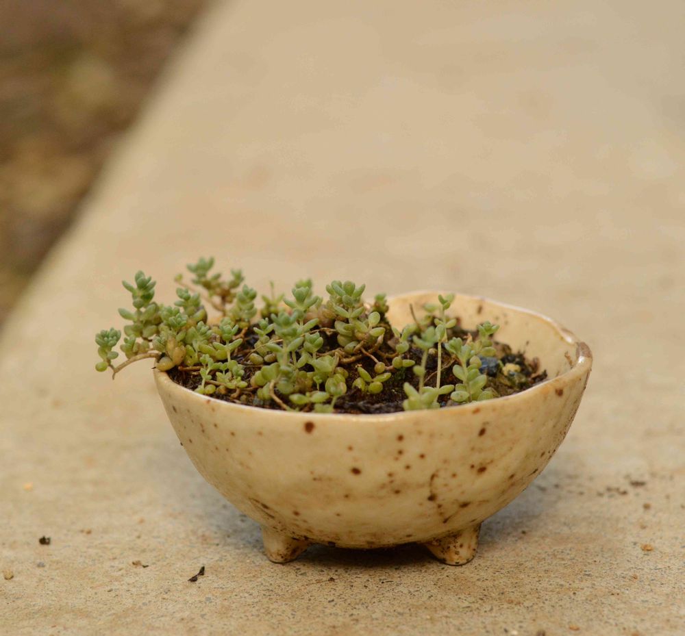 さん、柔らかい土に逆さにした器を置いて、穴を開けたい位置に木ネジを当てカナヅチでゴン、っとやって穴を開けるのです。成功するとは限らないので100均の陶器とかでまずはお試しを〜