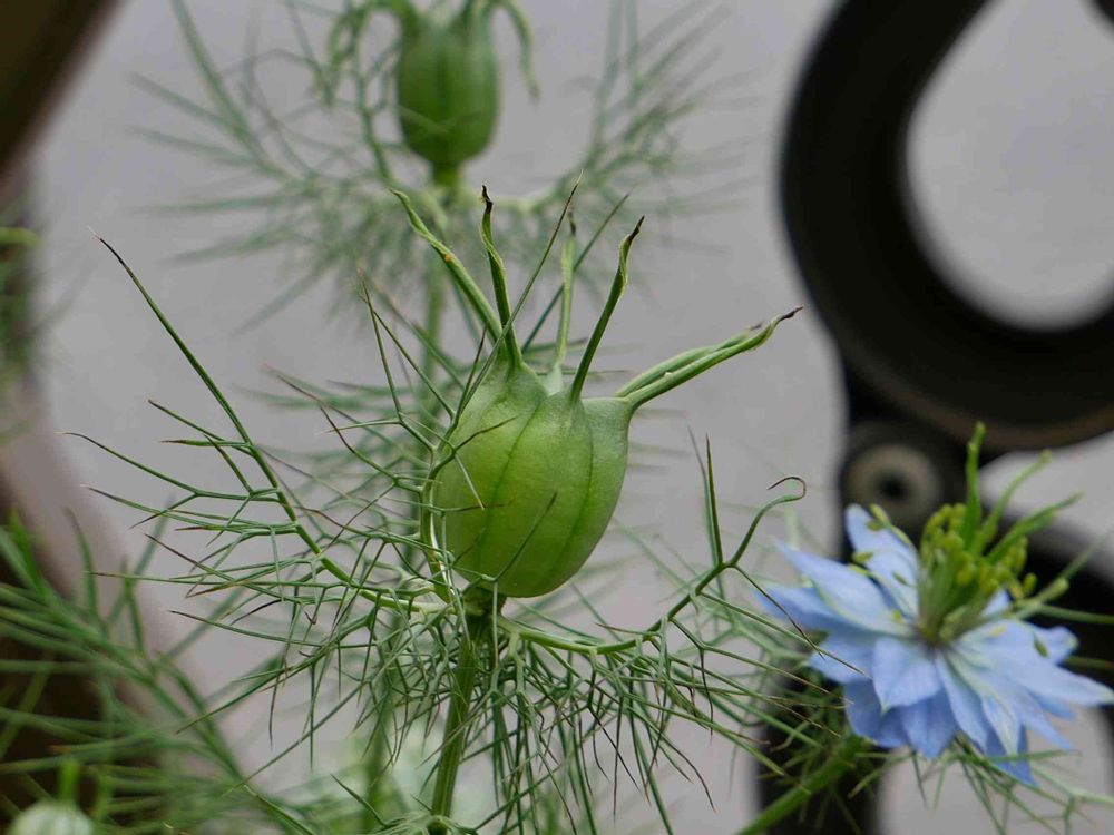 ニゲラの花と膨らんだ雌しべ。
