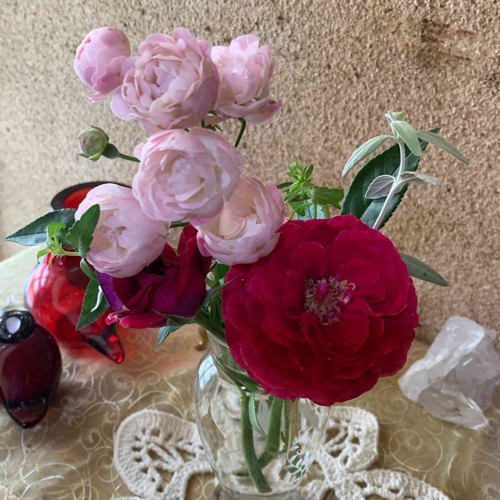 ハッピーマザーズディとアストリットグレーフィンフォンハルデンベルグを花が散る前に花瓶に挿しました。とても良いダマスク香が漂っています💕☺️
