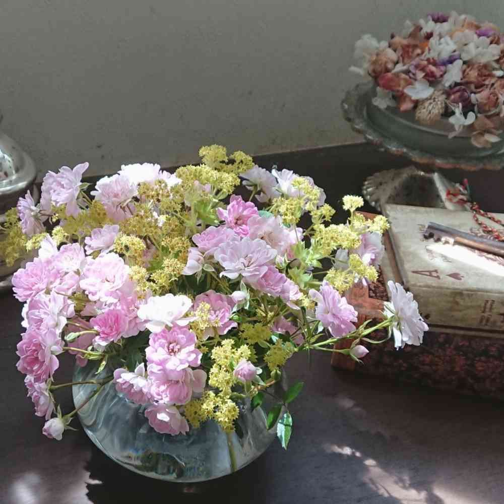 小輪八重咲きのバラ宇部小町がたくさん咲いたのでアルケミラ ゴールドストライクの黄色いお花と一緒に.。.:*♡✿ฺ