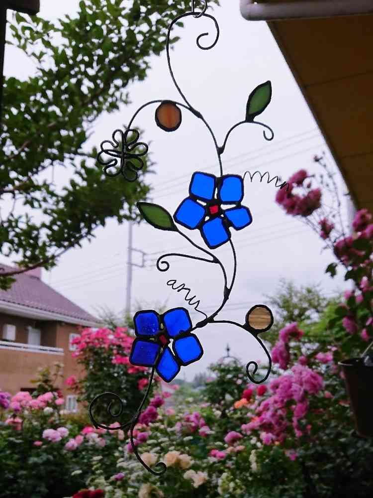 ステンドグラスのワイヤーオーナメント涼しそうで可愛らしいのが出来たんですね😃窓のところに下げると色も輝いて素敵です。