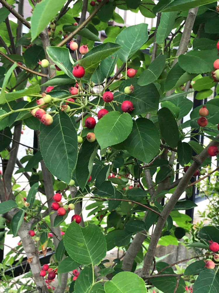 草取りの仕事をして帰ってジューンベリーの傍に✨ちょっと赤いのも口に入れたら甘〰いって感じで主人とぜ〰んぶ食べちゃいました 😋🍴💕って