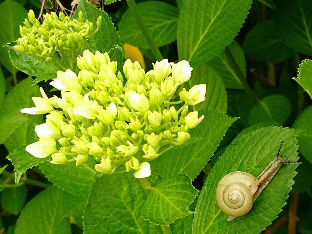 咲き始めたアジサイの葉っぱをゆっくりと進んでました。