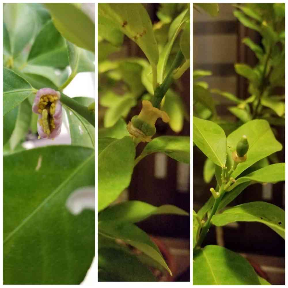 アレンユーレカレモンの果実が順調についてきてますが、一部2つか3つの花がくっついてしまい(写真左)、花びらが取れたあとから真ん中の写真のようになっています。