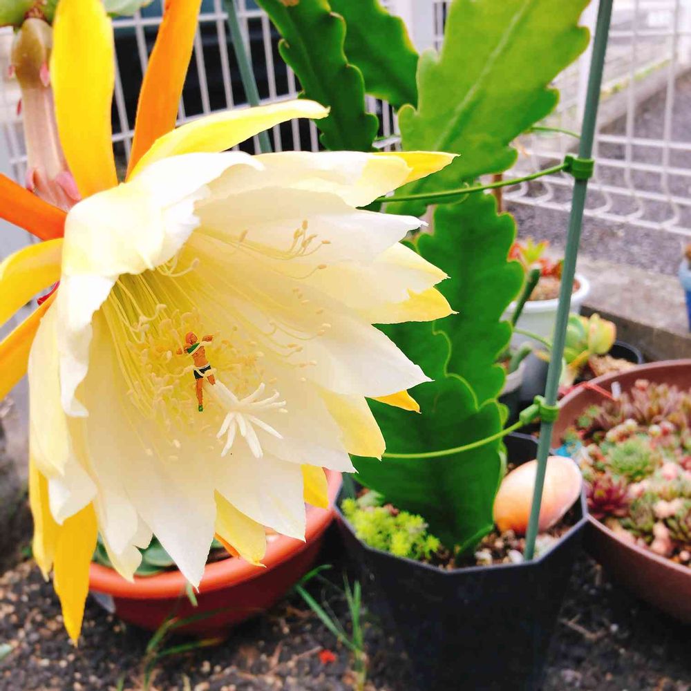 去年頂いた、孔雀サボテン、土にブスっと指したやつ、昨日花が咲きました👐✨