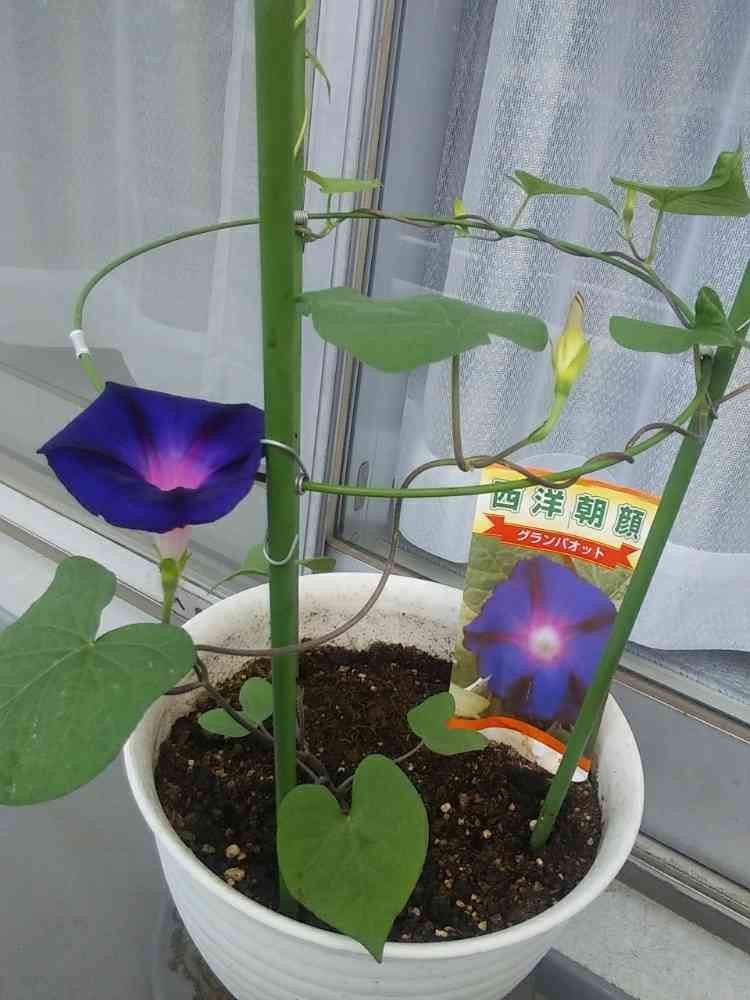 西洋朝顔グランパオット 咲きました‼️♥️実は2つ目です。最初のは蕾の巻きが強くて、うまく開かなかったので摘み取ってしまいました。思っていたより小型の花でした。ヘブンリーブルーの方が花は大きく成りますね。まだつるがさほどでもないのに、蕾付いてまーす‼️楽しみ‼️