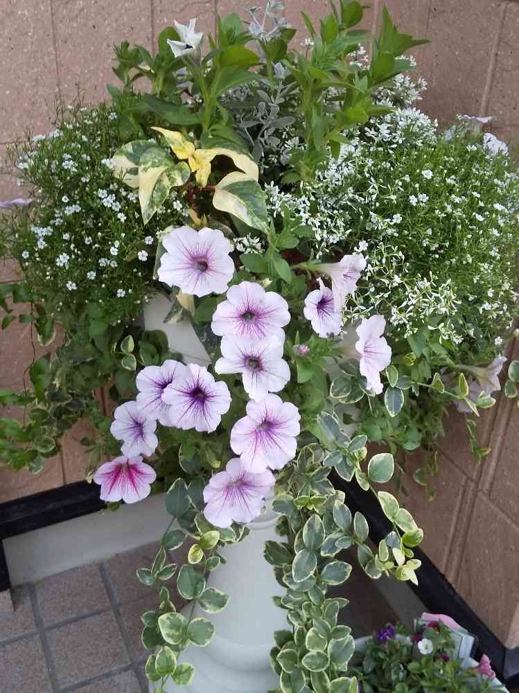 こちらのメインの花はペチュニアウェーブライラックアイスとラズベリーアイス、スーパーチュニアビスタシルバーベリー、真ん中にランドスケープペチュニアTOKYOを植えました✨