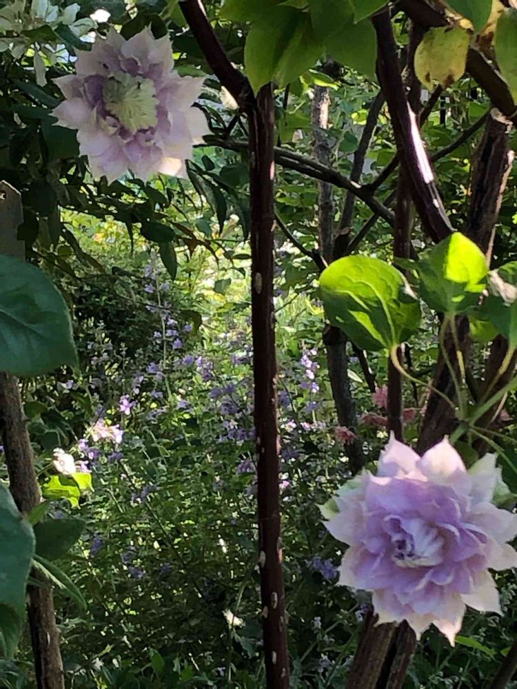 ルージュ ピエールの下で咲いてます この辺りは数種類のクレマチス が植えられています😅この子が3番目の開花💕💕💕