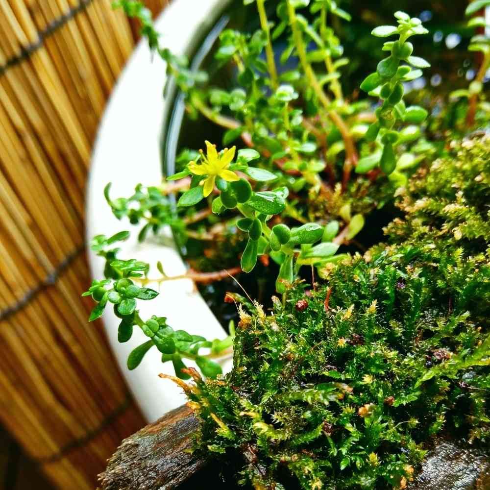 母の家の近くから採取した苔に自生していた草に黄色の花が咲きました。調べたところ、コモチマンネングサのようです。可愛い花です。