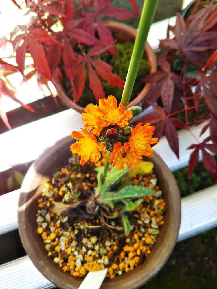 教えてください、第二投稿です。おはようございます。先週一升瓶の空き瓶集会所に持参しました。公園には芝(芝負けてます)と負けないくらい、黄色のタンポポが咲いていましたが、一つだけオレンジの花、咲いていたので持ってきました、タンポポと同じ飛んで来たと思います❗️名前教えてください、お願いします。
